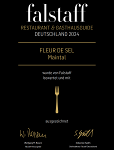 Im Laufe der vergangenen Jahre gelang es dem „Fleur de Sel“ wiederholt verschiedene Auszeichnungen zu erringen, unter anderem in Rhein Main geht aus 2013 – 2016, Gastronomiepreis Hessen 2013, Zertifikat für Excellence bei Tripadvisor und Empfehlungen in den Gourmetführern Michelin und Varta. Dank gilt insbesondere unseren Gästen, die uns in allen gängigen Bewertungsportalen ihre Beurteilung abgaben und uns, so weit über die Grenzen Maintals hinaus bekannt machten.